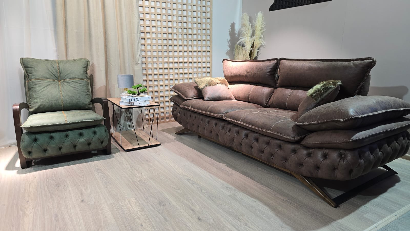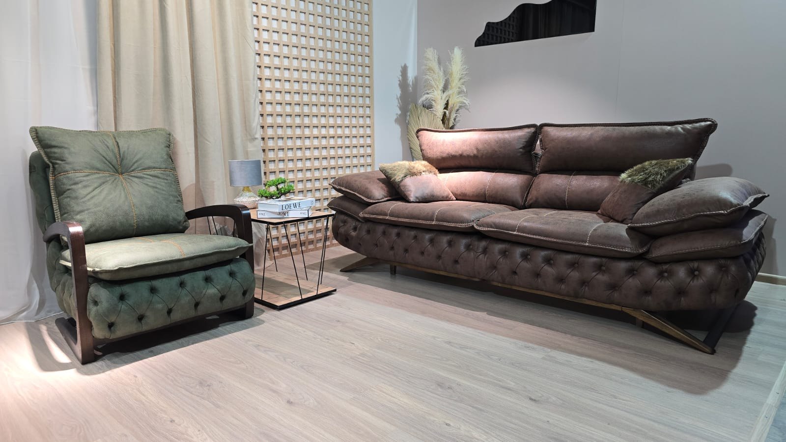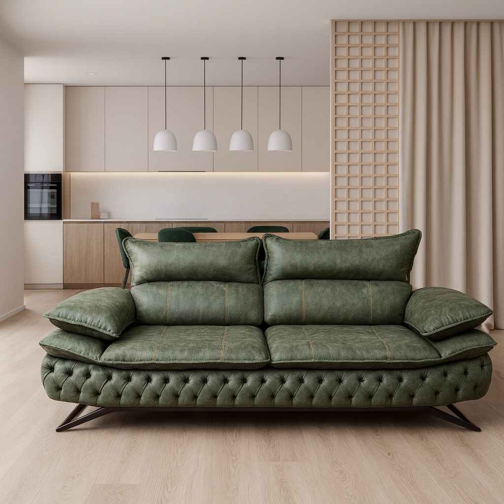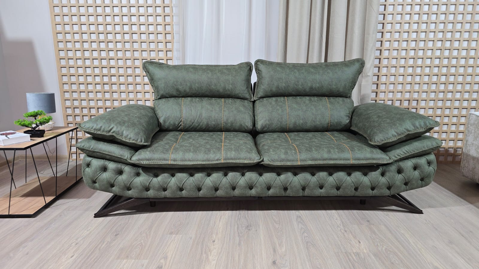 Диван «Хеопс» сочетает эргономичный комфорт и стильный дизайн. Его ключевая особенность — отшагивающая спинка, создающая положение релакс. Уникальность модели подчеркивает декоративная отделка: классическая каретная стяжка и контрастная отстрочка мокасиновой нитью. Наполнитель из высокоэластичного пенополиуретана ELAX обеспечивает идеальную поддержку тела.