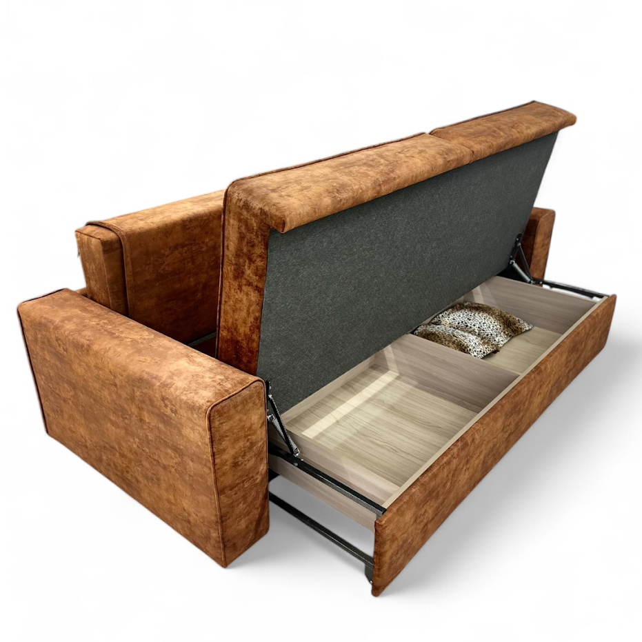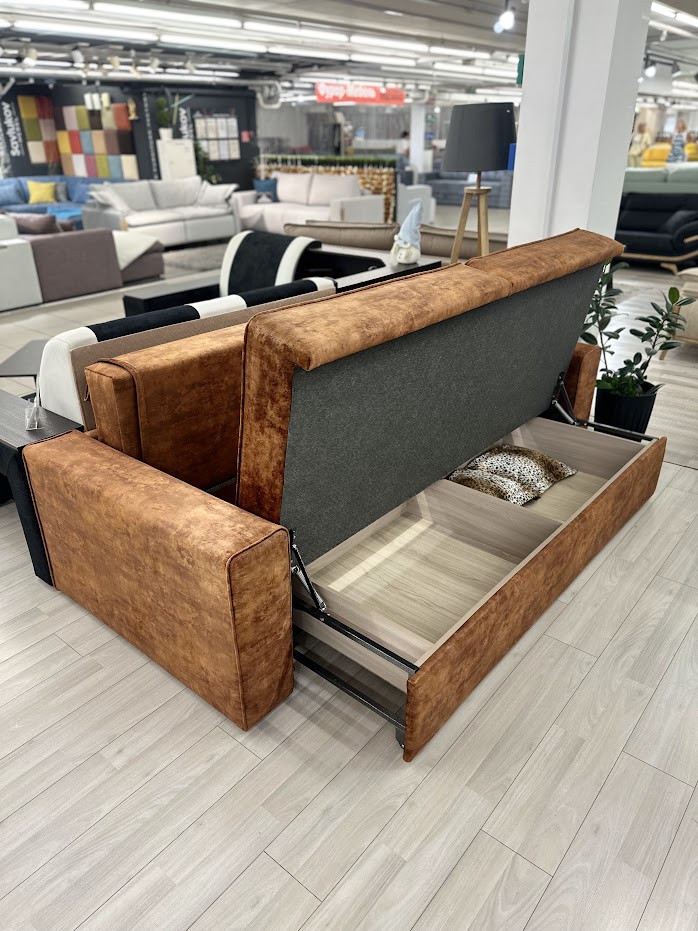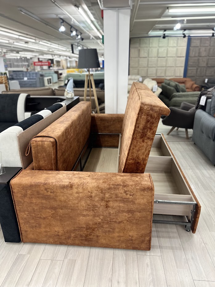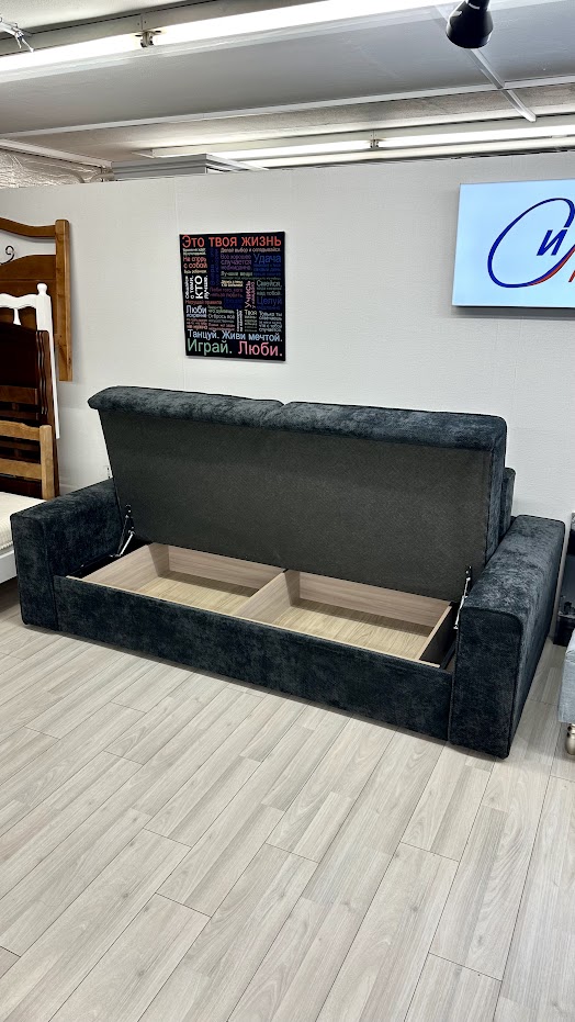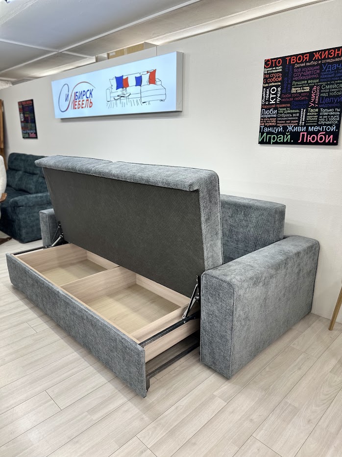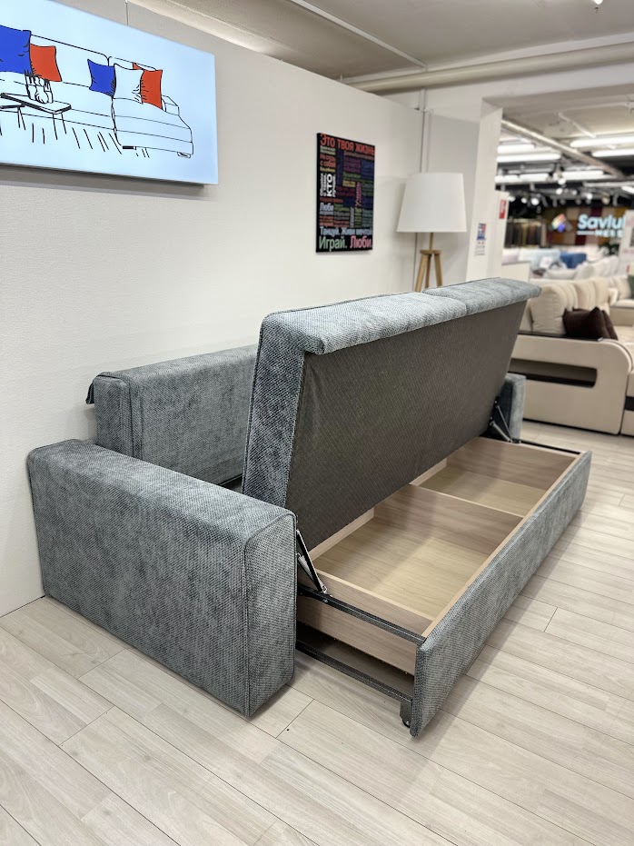 Принцип действия механизма сундук очень прост и удобен, что бы получить полноценное спальное место, нужно выкатить сиденье вперед и опустить спинку дивана. Стоит вам поднять сиденье и вы имеете доступ к бельевой нише. Возможна замена подлокотников/подушек.