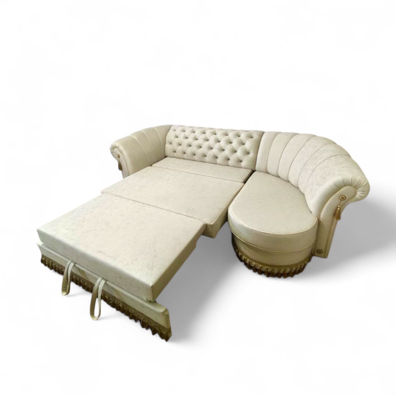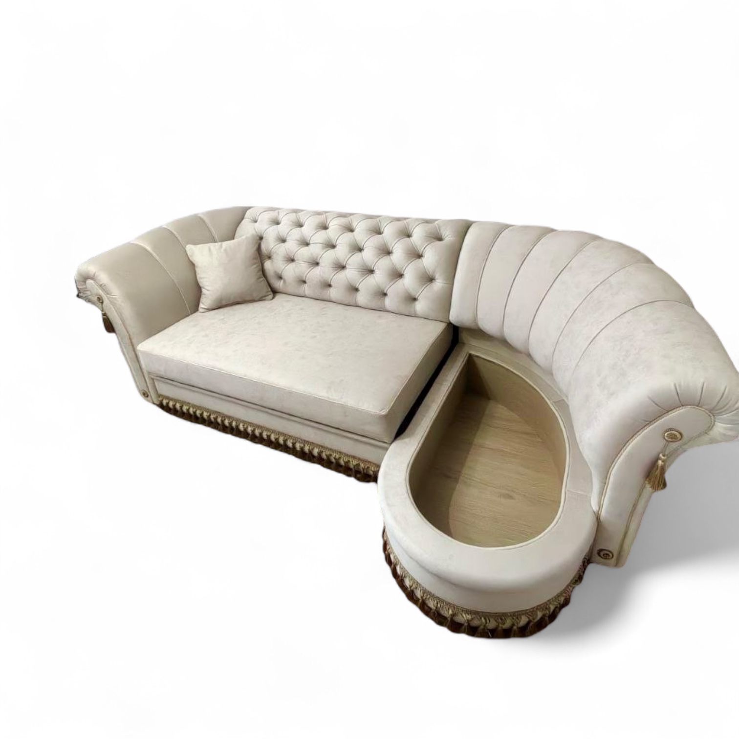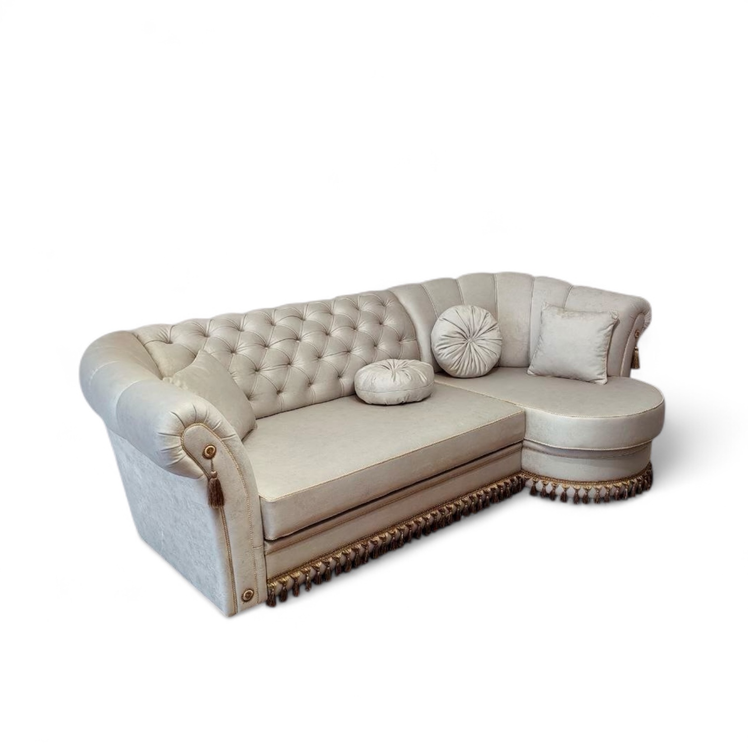 Диван «Опера» настоящая находка для любителей благородных восточных форм и одновременно классических интерьеров, где декор является неотъемлемой частью интерьера. Силуэт дивана прекрасно дополнит классическую обстановку, будет выделяться в ярких тканях или гармонично впишется в интерьер, если выполнен в пастельных тонах. Необычная отделка кантом и бахромой придает свою «изюминку» всему окружающему пространству. Диван имеет вместительные ящики, тройной механизм раскладки, основание из фанеры и ППУ, возможно изготовление на пружинном блоке.