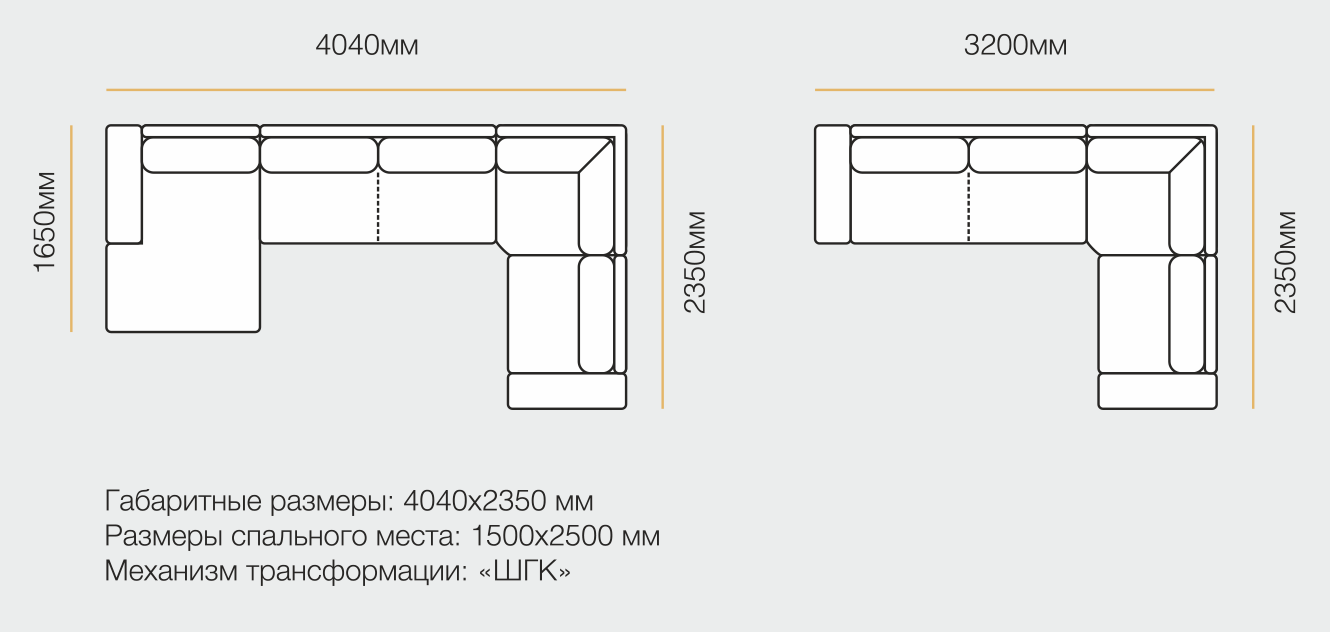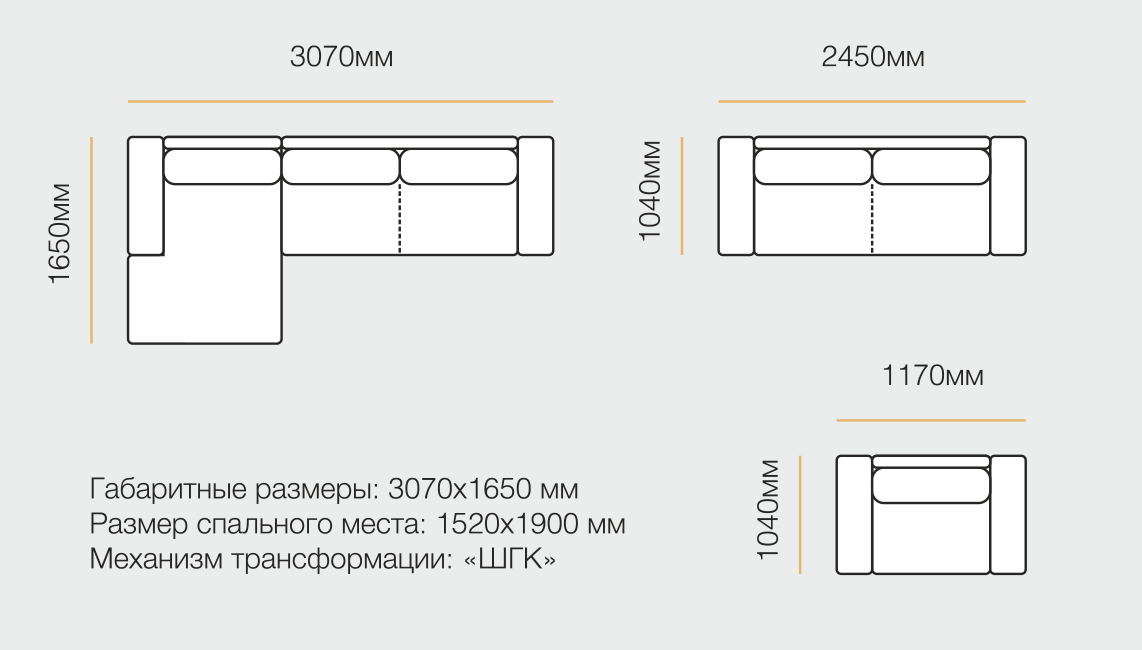 П-образный габариты: 4040х1650х2350 мм. Спальное место: 2500х1500 мм. Угловой габариты: 3200х2350 мм. Спальное место: 2500х1500 мм. С оттоманкой габариты: 3070х1650 мм. Спальное место: 1900х1520 мм. Прямой габариты: 2450х1040 мм. Спальное место: 1950х1520 мм. Механизм: тик-так. Кресло габариты: 1170х1040 мм.