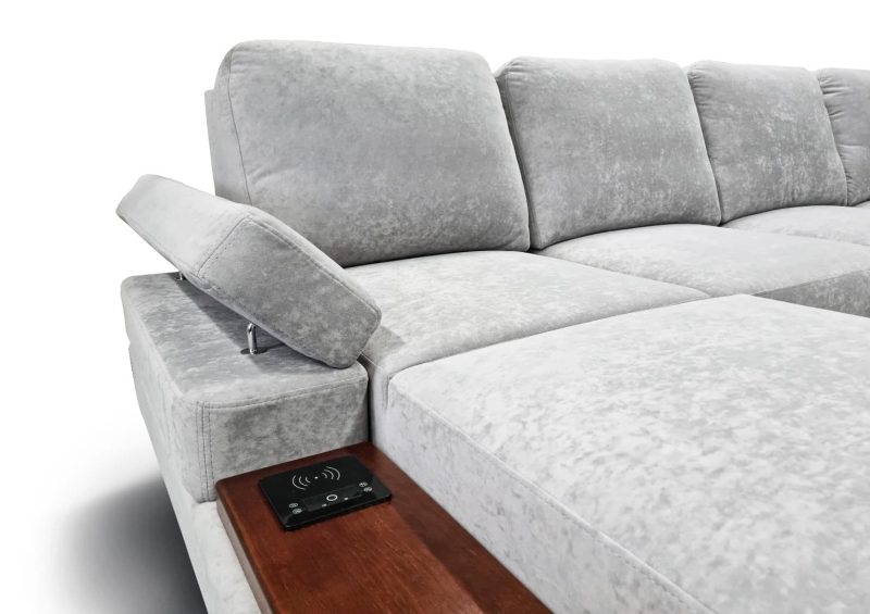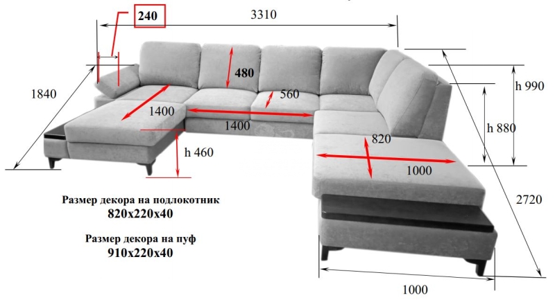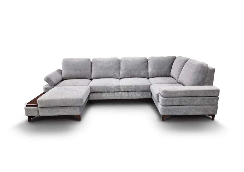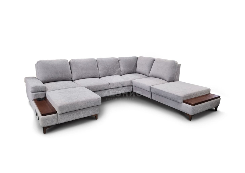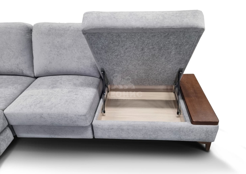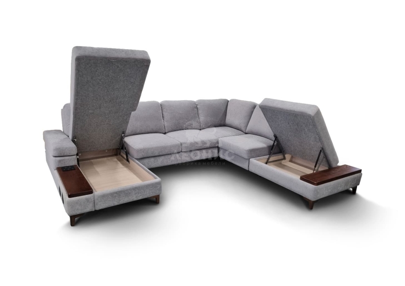 - Диван состоит из 5 частей: оттоманки, диванной части, мягкого сектора, полукресла с ящиком и диванного пуфа.