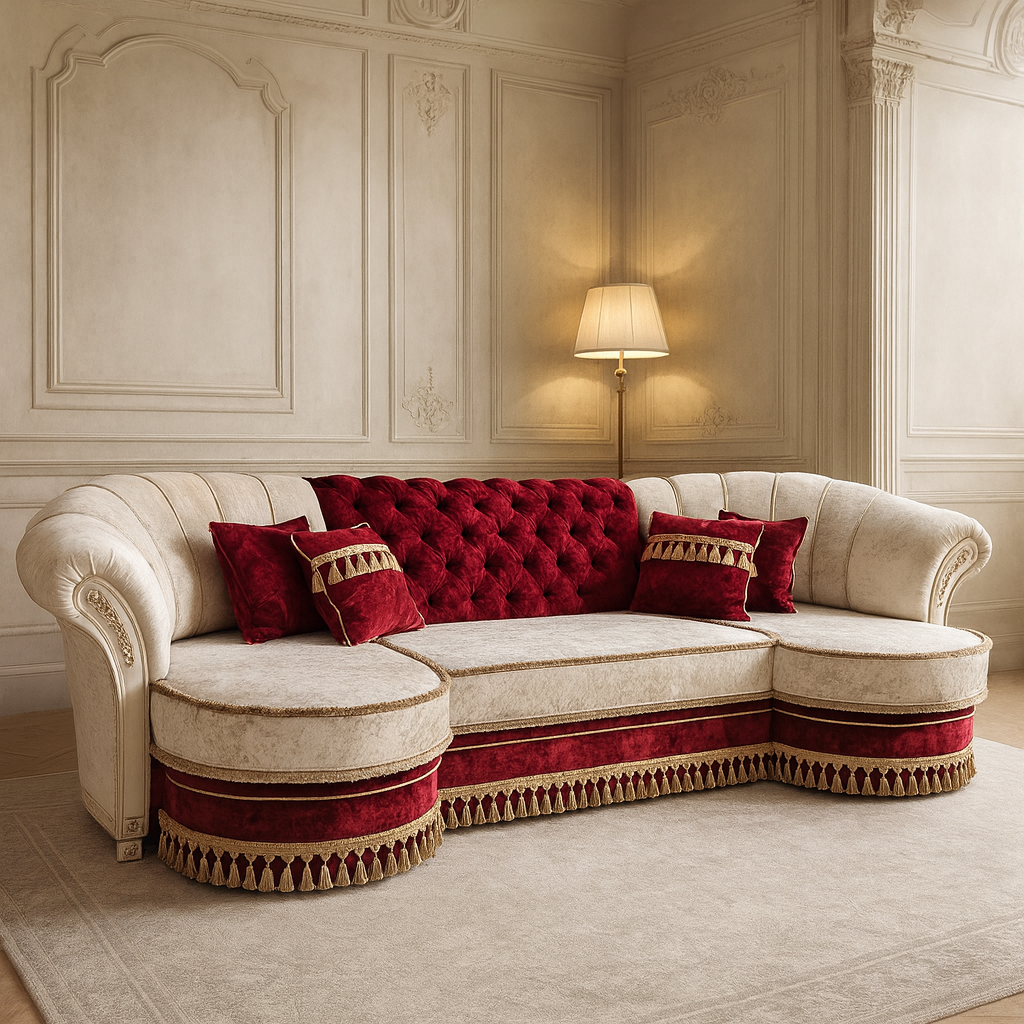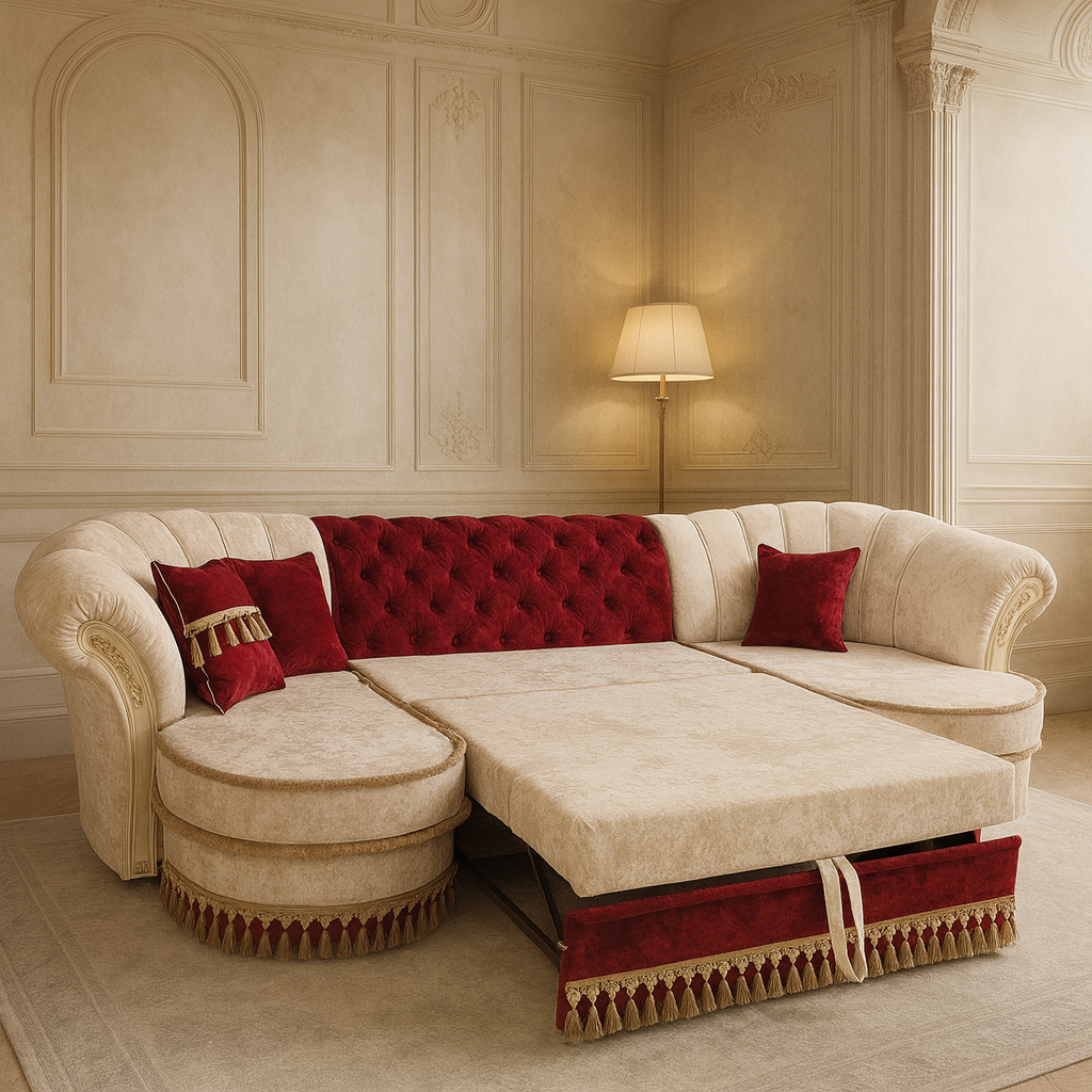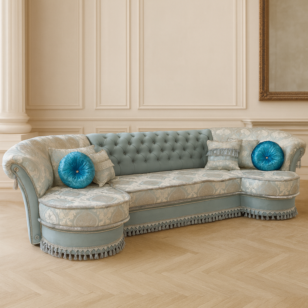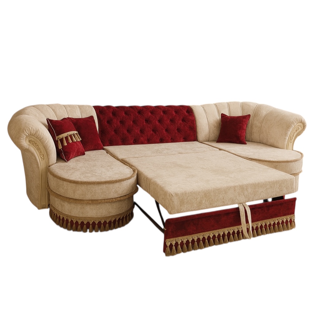 Диван «Опера» настоящая находка для любителей благородных восточных форм и одновременно классических интерьеров, где декор является неотъемлемой частью интерьера. Силуэт дивана прекрасно дополнит классическую обстановку, будет выделяться в ярких тканях или гармонично впишется в интерьер, если выполнен в пастельных тонах. Необычная отделка кантом и бахромой придает свою «изюминку» всему окружающему пространству. Диван имеет вместительные ящики, тройной механизм раскладки, основание из фанеры и ППУ, возможно изготовление на пружинном блоке.
