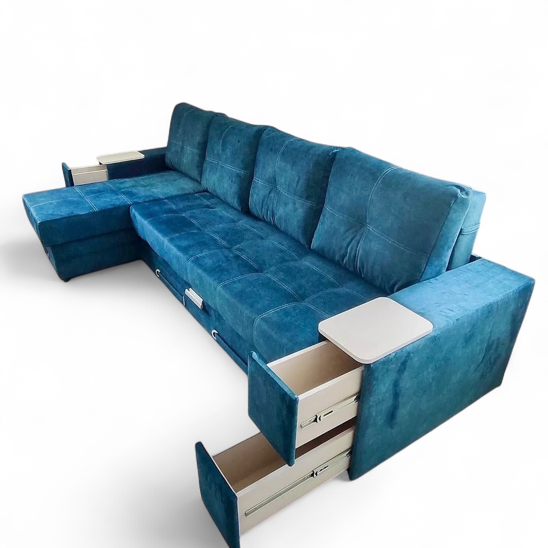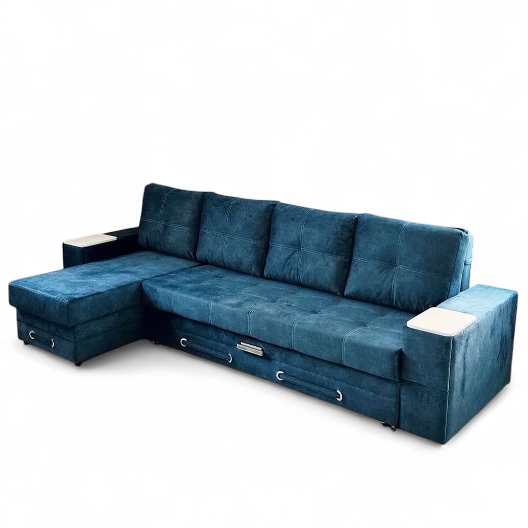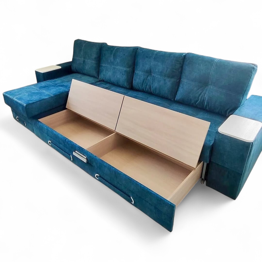 Диван изготовлен на основе металлокаркаса. Основной особенностью этого дивана, является выкатной механизм, который позволяет легко трансформировать его в полноценное спальное место. Вы можете выбрать одно из двух удобных положений: вдоль стены (2100х1580 мм) для экономии пространства, или поперек (2100х2070 мм), что даст возможность большого спального места. Данный механизм предоставляет лекгий доступ к бельевым ящикам, расположенным спереди, что делает хранение постельного белья и других предметов особенно удобным. Наполнение из независимого пружинного блока обеспечивает комфортную поддержку и оптимальное распределение веса, что важно для качественного сна. В обоих подлокотниках имеются специальные ниши для хранения, где можно разместить полезные мелочи. Такой диван идеально подходит как для отдыха, так и для сна, сочетая в себе функциональность и стильный дизайн.